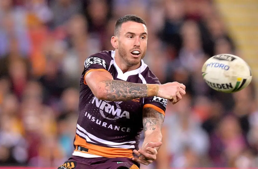 BRISBANE, AUSTRALIA - JUNE 09: Darius Boyd of the Broncos passes the ball during the round 14 NRL match between the Brisbane Broncos and the South Sydney Rabbitohs at Suncorp Stadium on June 9, 2017 in Brisbane, Australia. (Photo by Bradley Kanaris/Getty Images)