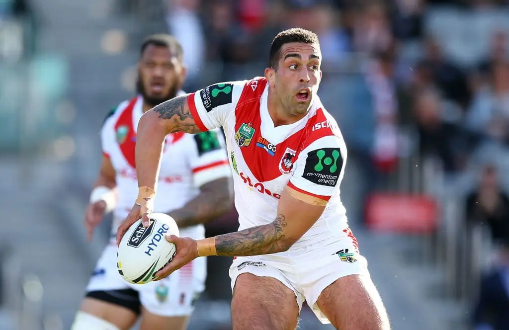 WOLLONGONG, AUSTRALIA - JULY 23: Paul Vaughan of the Dragons looks to pass during the round 20 NRL match between the St George Illawarra Dragons and the Manly Sea Eagles at WIN Stadium on July 23, 2017 in Wollongong, Australia. (Photo by Mark Nolan/Getty Images)